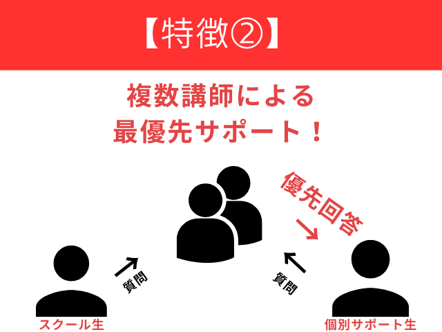 個別サポート生には複数の講師でサポートします(e.school生は講師一人)質問やサポートは個別サポート生を優先しておりますので、スムーズなやり取りが可能です。